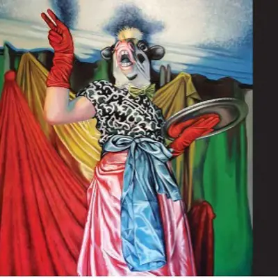 Niswonger sets up her paintings as a stage, complete with backdrops, actors, costumes, and dramatic lighting. Hints of various real-life news stories show up as props or positions in her pieces (such as a 2017 story about cows eating Skittles). Through her vivid use of color, custom-built canvases, and precise painting techniques, Niswonger plays up the drama and spectacle of the news cycle. By doing so, she also calls out the humor and hypocrisy of performatively re-posting digital content.