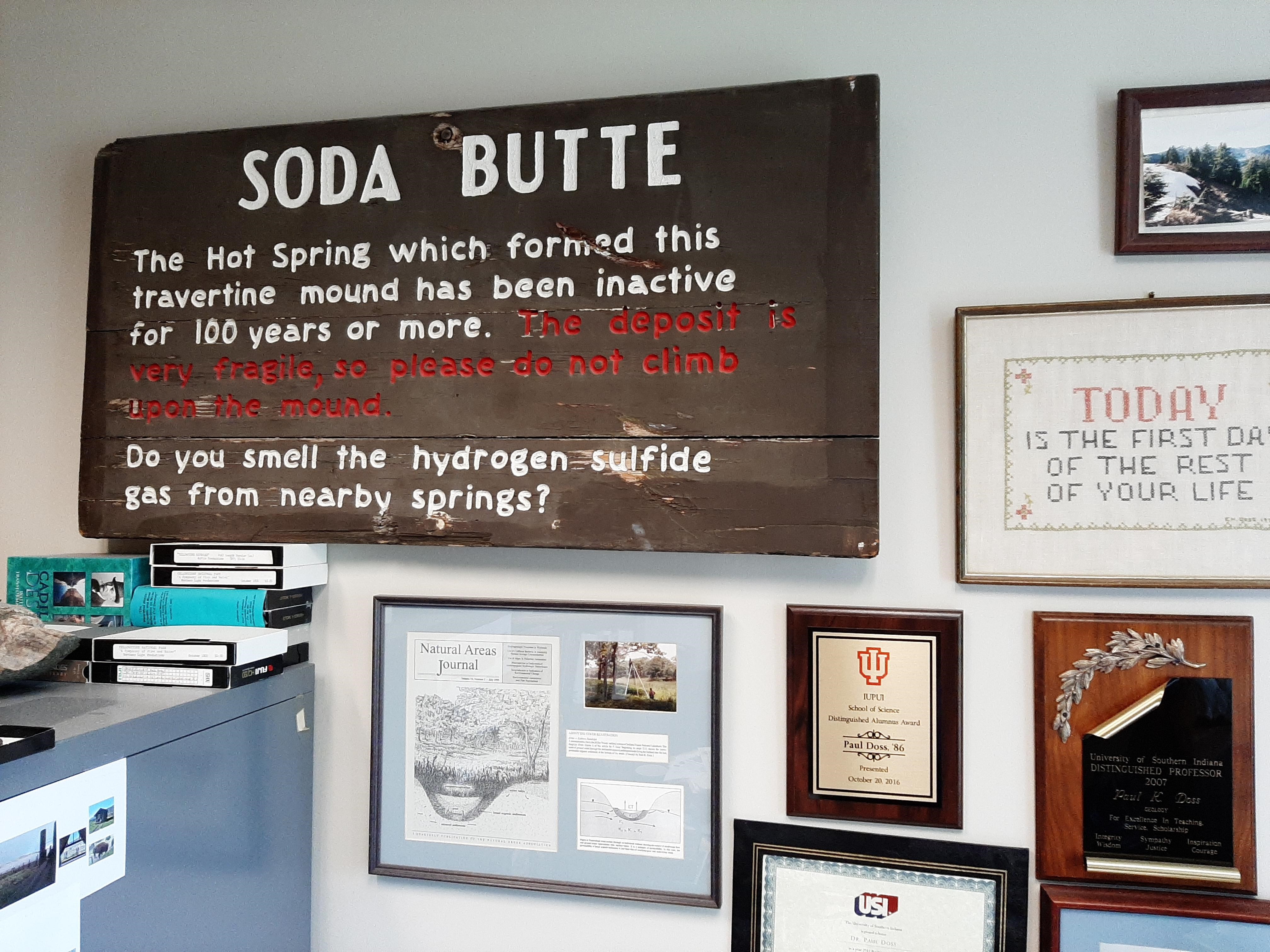Hanging in his office, in the Geology and Physics Department, is an original Yellowstone interpretive sign for the Soda Butte Hot Spring. This sign was a gift from the park's sign maker after Doss took time off from USI to serve as the Supervisory Geologist at the park in 2001.