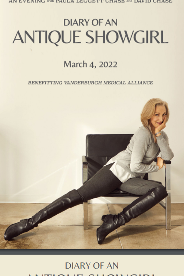 In "Diary of an Antique Showgirl," Evansville native Paula Leggett Chase peels back the curtain on her life as a Broadway actress, wife and mother with candid stories and observations formed over a three-decade career on stage and television. Her husband David Chase, Broadway Music Director and Arranger, accompanies her on stage to bring this show to the Evansville community.