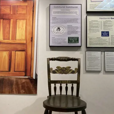 The "Devout & Disciplined" exhibition presents an overview of the Harmony Society's history, building the town, experiencing living in community, conducting commerce and ultimately leaving for Economy, Pennsylvania. Since The Harmonists referred to their town as Harmonie, this exhibition uses New Harmony to avoid confusion with the first settlement, also called Harmonie.