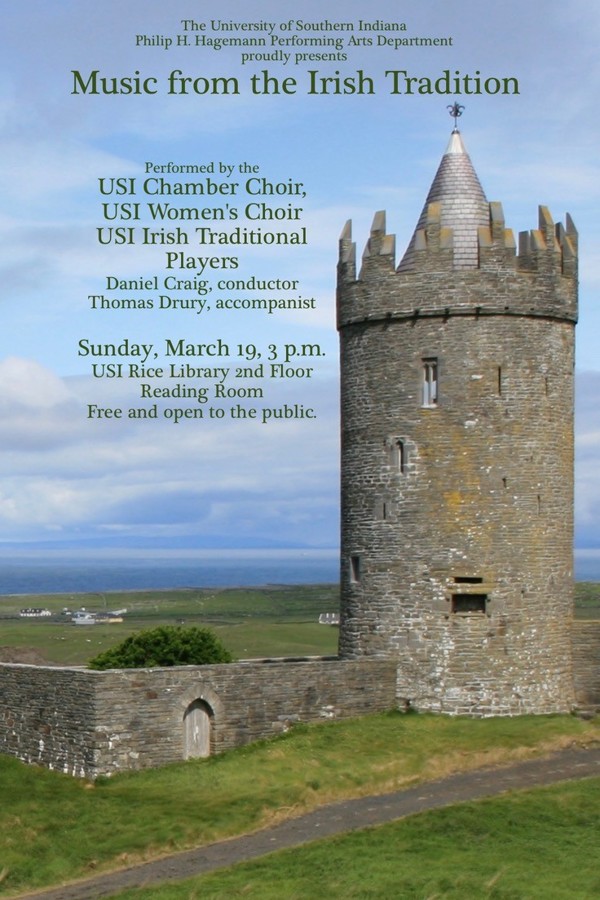 The University of Southern Indiana Philip H. Hagemann Department of Performing Arts is proud to present “Music in the Irish Tradition,” a concert by the USI Women’s and Chamber Choirs and the USI Traditional Players. The concert is scheduled for 3 p.m. Sunday, March 19 in the David L. Rice Library second-floor Reading Room. The concert is open to the public at no charge.
