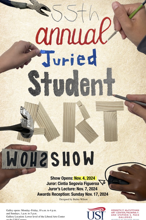 The University of Southern Indiana annual Juried Student Art Exhibition, a presentation of selected student artworks from the past academic year, is being held Monday, November 4 through Friday, December 6 at the McCutchan Art Center/Pace (MAC/Pace) Galleries, located in the lower level of the Liberal Arts Center. This year’s exhibition features 101 artworks chosen by the juror from 218 entries.