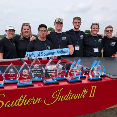 The University of Southern Indiana’s Solar Splash Team brought home an array of honors at the annual solar boating competition in Springfield, Ohio. The team, consisting of seven students, advised by Dr. Paul Kuban, Professor of Engineering, earned first place in the sprint and slalom events and took home second place overall.