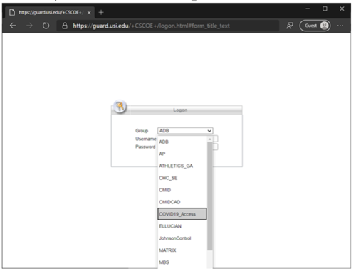 Open a web browser (preferably Google Chrome) and go to https://guard.usi.edu (you may need to type in the ‘https://’ part in order for it to connect. Select the drop down menu and choose ‘COVID19_Access’