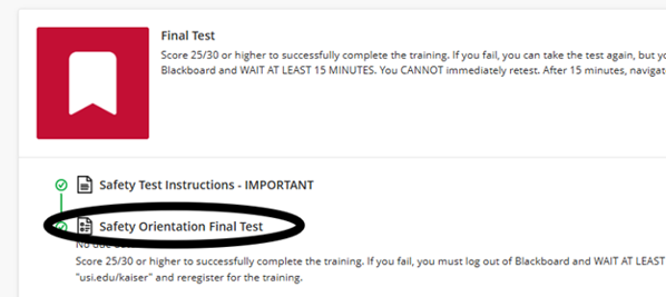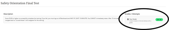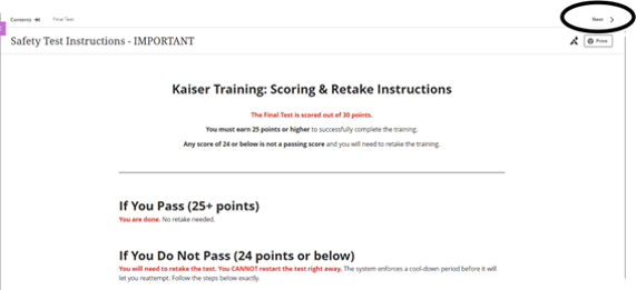 If you do not pass (24 points or below) you will need to retake the test. YOU CANNOT RESTART THE TEST RIGHT AWAY. The system enforces a cool down period of 30 full minutes. You will need to start from the beginning by registering for the training again.