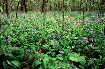 The 500-acre site is home to a wide variety of plants, including a large spread of Virginia bluebells (shown to right).
