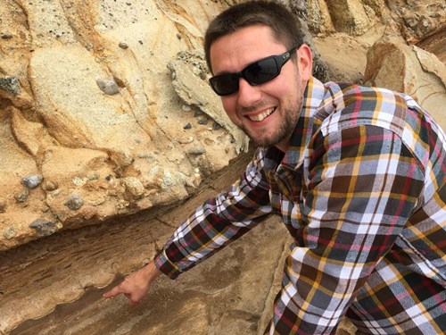 Michael Stephens graduated with a B.S. degree in Geology in Spring 2015 from USI. In this photograph, Michael is pointing out cross-bedding in a sandstone exposed along the California coast.