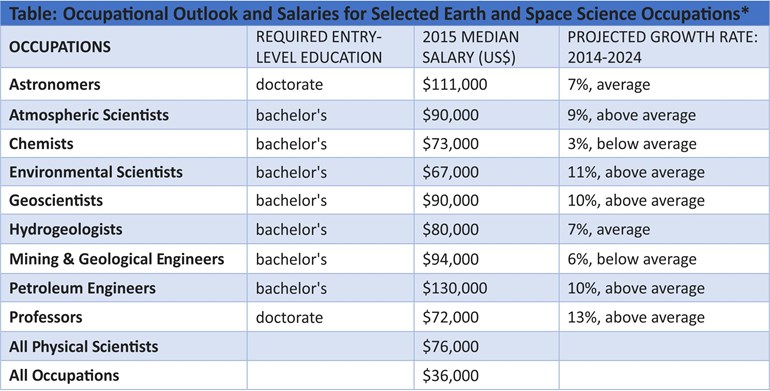 Geoscientists (geologists and environmental scientists) are employed in a wide range of academic, industrial, and governmental positions. Salary varies greatly, but is generally more than $35,000 a year for entering geoscientists. Some petroleum geologists have a beginning salary of $75,000 per year. Starting salaries increase significantly with completion of a Master’s degree in geology, with environmental consulting positions starting at $45,000 and petroleum geologists starting at $102,900 per year (AAPG 2015 Salary Survey). In most cases, high performing geology students will be able to complete a M.S. degree at no additional cost via tuition waiver, along with a stipend for conducting research or teaching at the University. The following table summarizes salaries for selected Earth and Space Science occupations, and the average salary for physical scientists and for all occupations.