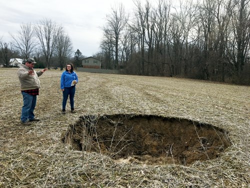 Hannah Walker ('18, Environmental Science) in the field during a site investigation. She is speaking with a landowner about the hole in his field. This work is associated with the Abandoned Mine Lands Program, and the goal will be to eliminate the safety hazard of this depression and restore the land for crop use.