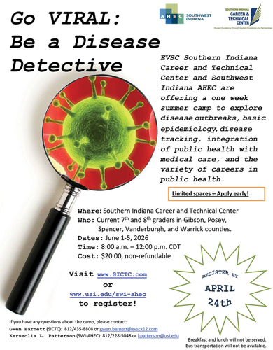 The camp is for students currently in the seventh and eighth grades in Gibson, Posey, Spencer, Vanderburgh and Warrick counties who are interested in exploring epidemiology and careers in public health. The camp will be held in the morning, June 1-5, 2026, at the SICTC, 1901 Lynch Road in Evansville.