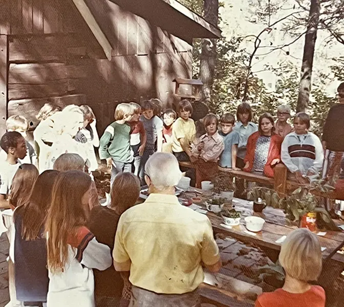 In time, the envisioned Girl Scout and Boy Scout Troops utilized it for environmental and ecological badge work and day camps. Local schools visiting the natural areas for supplemental instruction taught by science faculty. Doris, Eicher, who spearheaded most of the major projects in the Outdoor Education Center, worked with the local Audubon Society in foraging programs, serving up the local greens and mushrooms she gathered in woods surrounding campus.