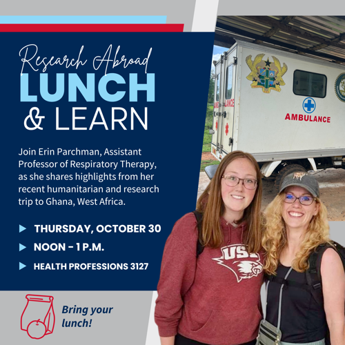 Join Erin Parchman, Assistant Professor of Respiratory Therapy, as she reflects on her recent humanitarian and research trip to Ghana, West Africa during a Lunch and Learn session at the Kinney College of Nursing and Health Professions.