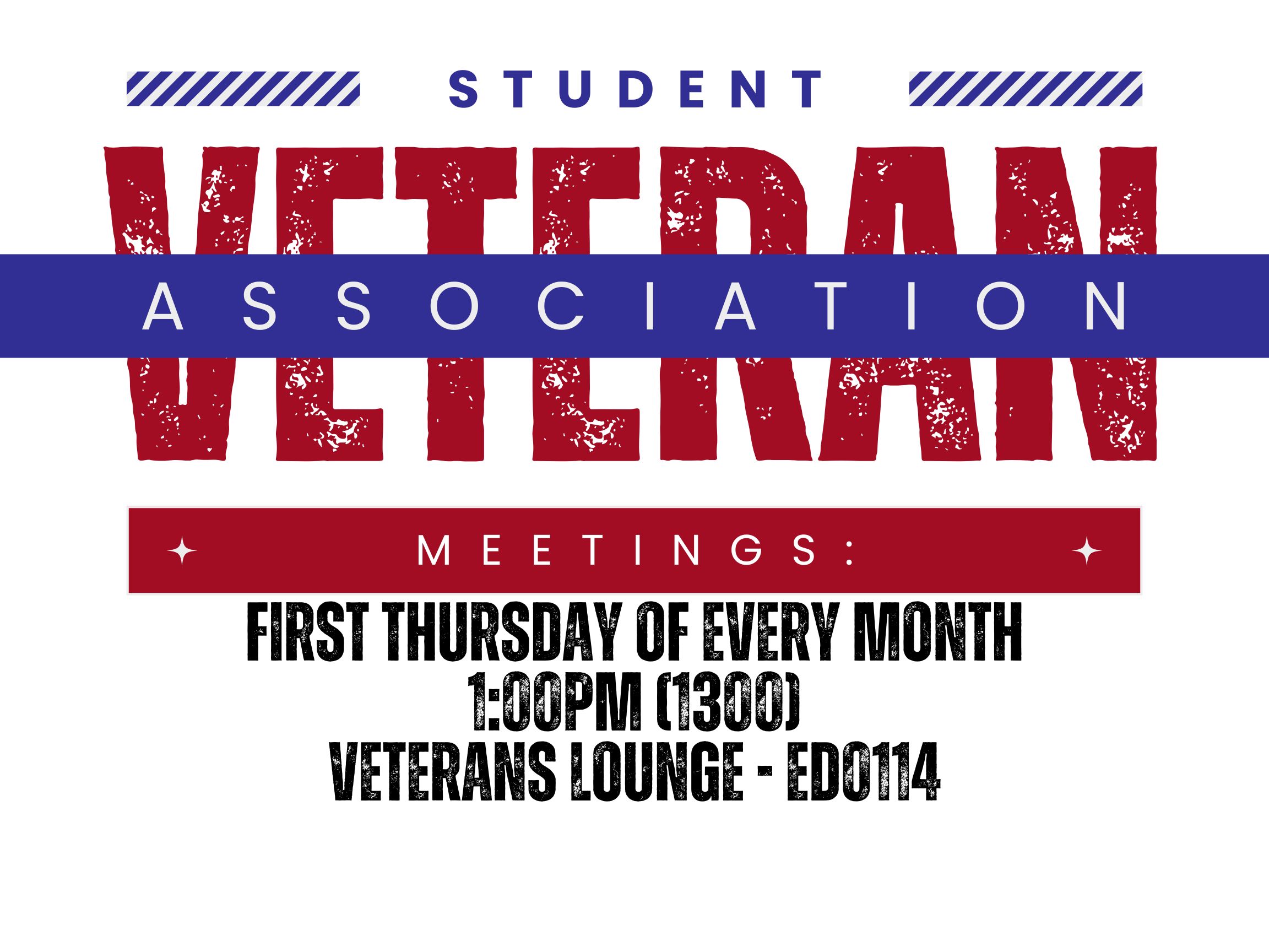 Monthly meetings are held the first Thursday of each month in the Veteran's Lounge (ED 0114) from 1:00 - 2:00 p.m.